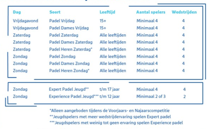 Het aanbod aan competitievormen voor 2026 is iets gewijzigd t.o.v. eerdere jaren. Er is nu een specifieke competitie voor alleen Heren bijgekomen op zaterdag en zondag. En er is voor de jeugd op zondag onderscheid gemaakt tussen de vaardigheid en leeftijd. Zie bijgesloten afbeelding.